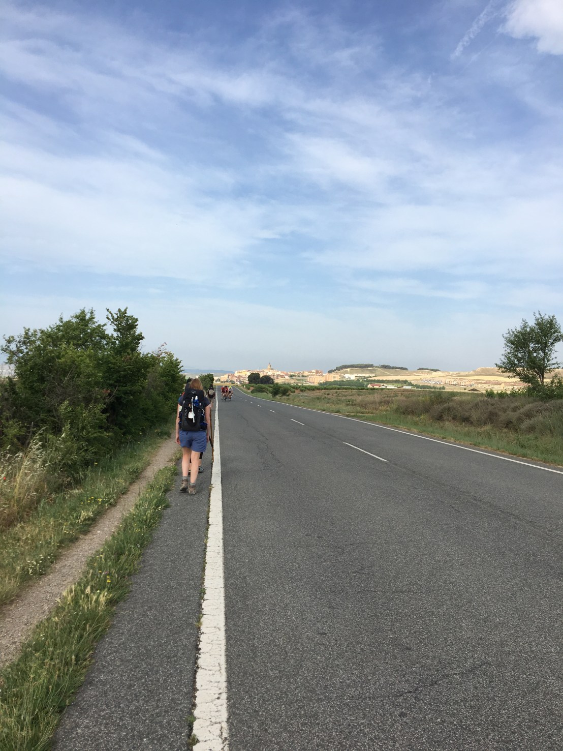 Two of us reached the next town ahead of the others and got an outside table. We got some fresh squeezed orange juice and coffee and waited for our friends. They arrived one by one. The last two arriving decided that because of feet and leg issues they needed to take the bus into Logroño. We all visited a few more minutes and then Sophie, Lindsay and I continued to walk.