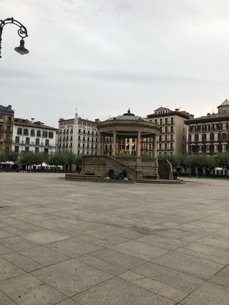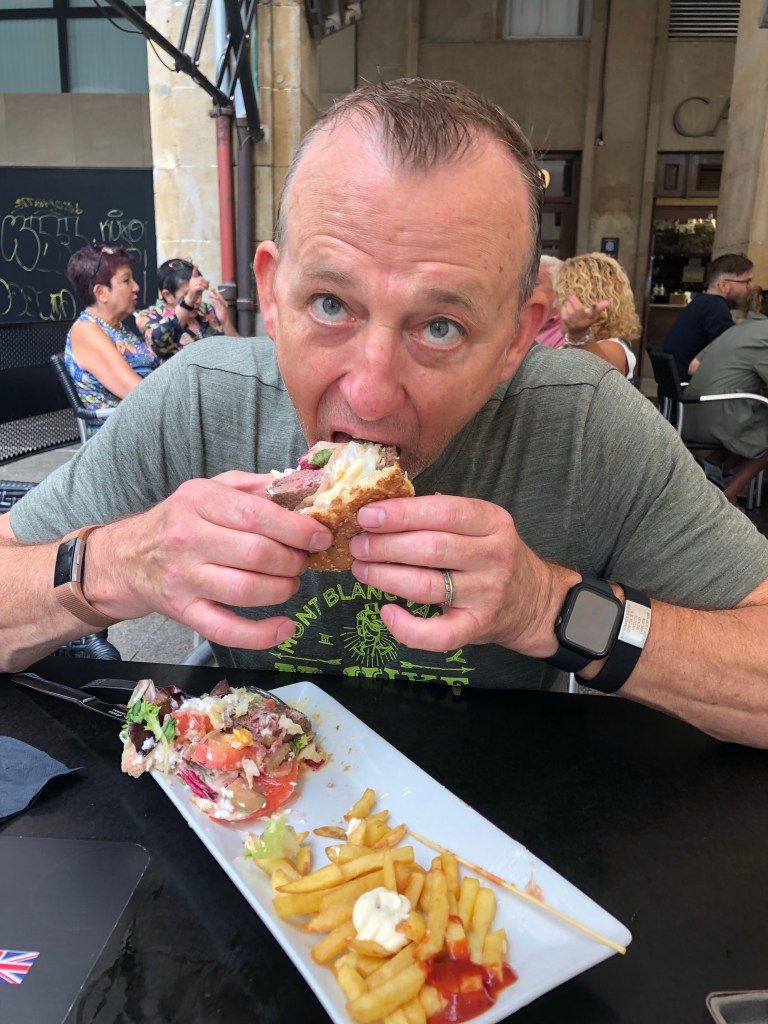After that we went on a scavenger hunt for sticks for Noël and a hairbrush for me. I talked him into good sticks. 🙂 Then it was back to the hotel, checkout and wait for our bus to St. Jean Pied de Port. So we sat down in the square (well one of them) and split a burger and fries. Wow that was good.