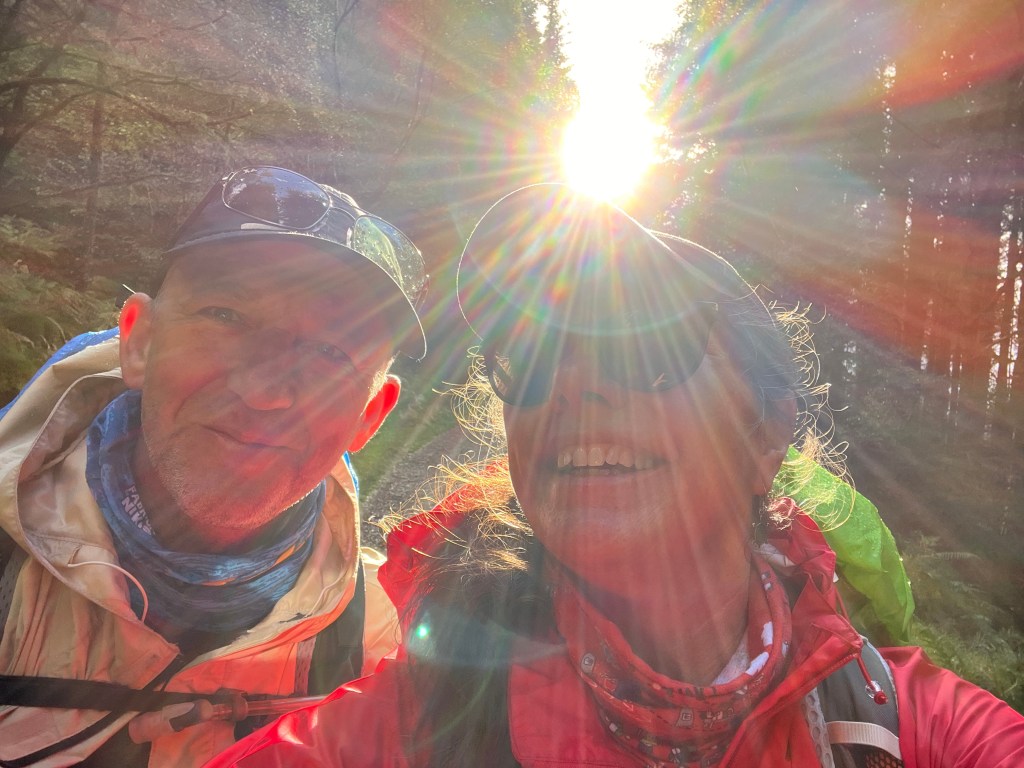 So let me get the weather report out of the way for obvious reasons and yet it has a funny story with it. So at some point I asked Noël what was the bright thing in the sky that was warming our backs? We took a few guesses☀️☀️☀️The rain drizzled and poured but for the most part there was that thing called ☀️ And it started getting really warm so Noël threatened to take off his rain gear. I said “don’t do it. There is a storm coming over that hill.” And yet he still took it off. Five minutes later he was scrambling to put it back on as I said it’s coming fast. I wish I’d gotten video. 😂😂😂 But we did have some sunshine.