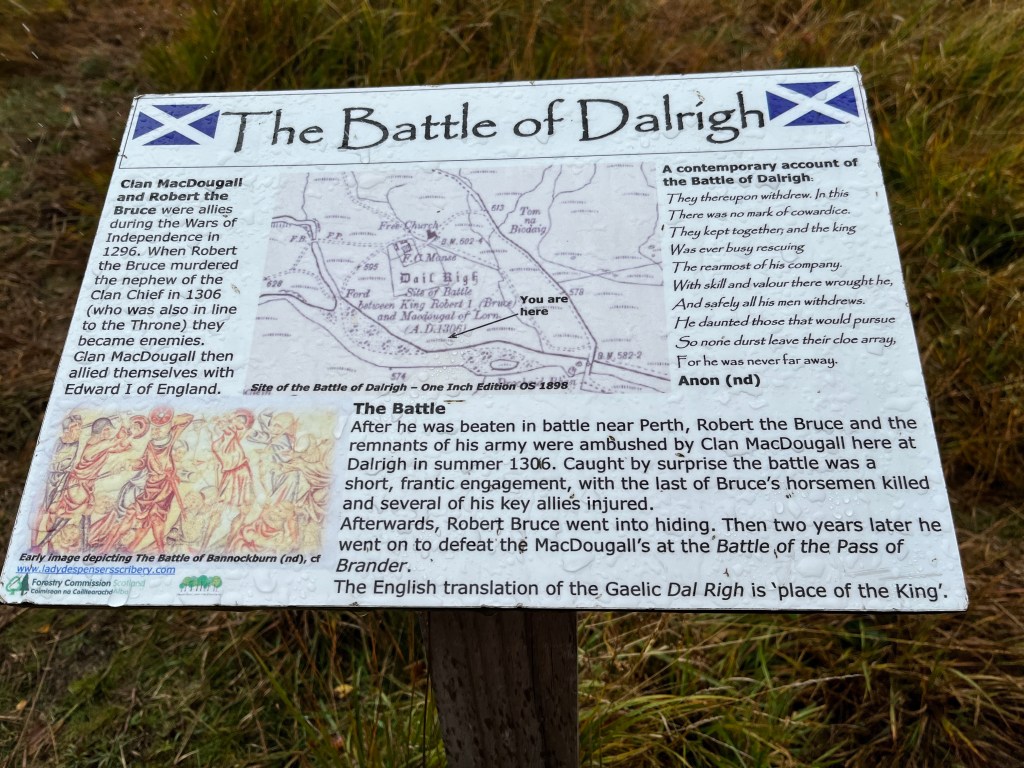 We saw benches that marked the spot of the Battle of Dalrigh and the Lost swords. These had to do with Robert the Bruce king of Scotland. I will share more about this later.