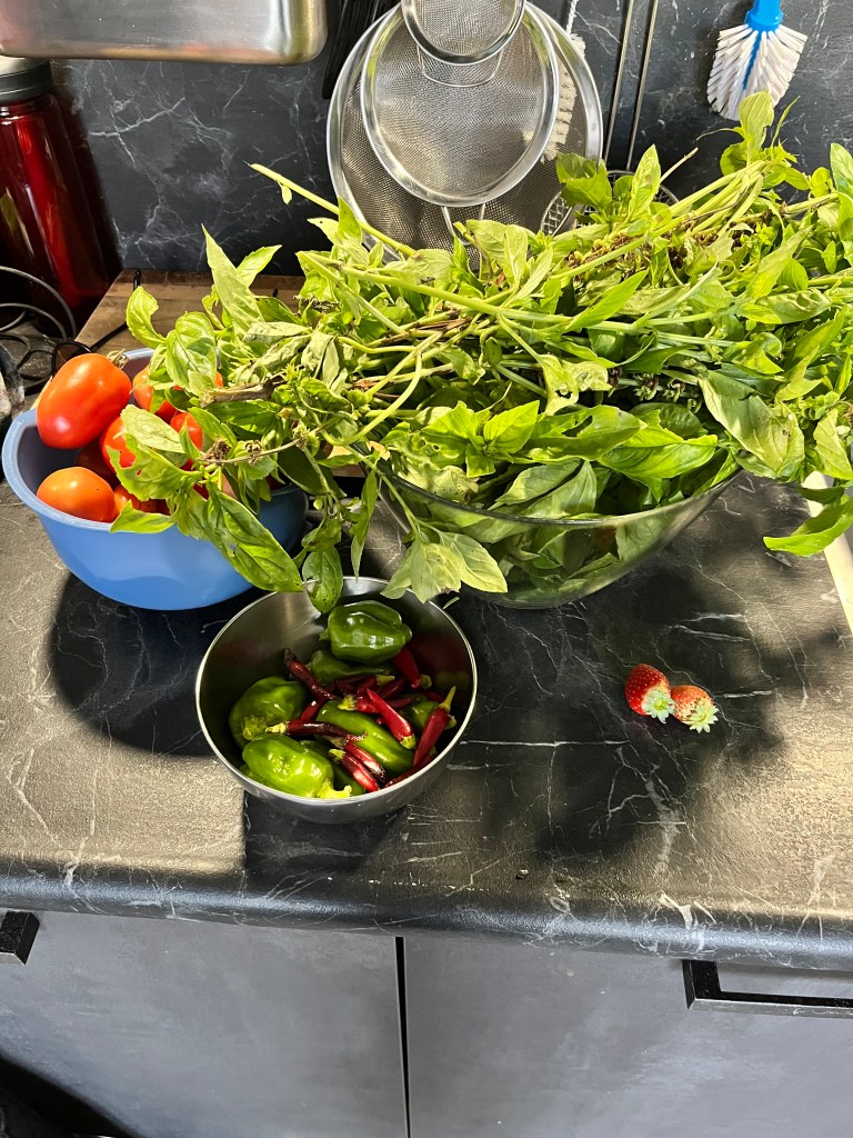 We dropped our bags and looked around. Our cat Shady had made the dining room table his place while we were gone. We quickly grabbed it and threw it in the wash. Next we went to the garden and harvested tomatoes, peppers, basil and two strawberries.