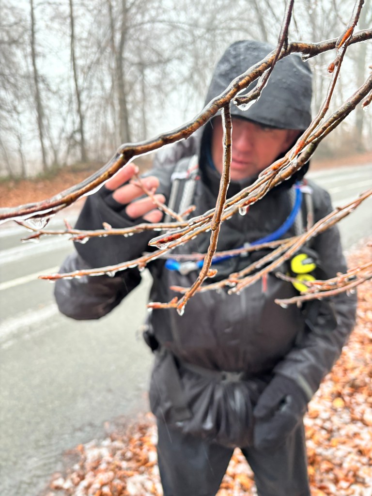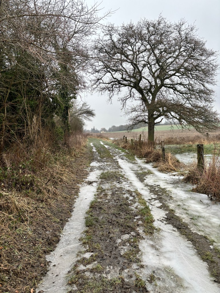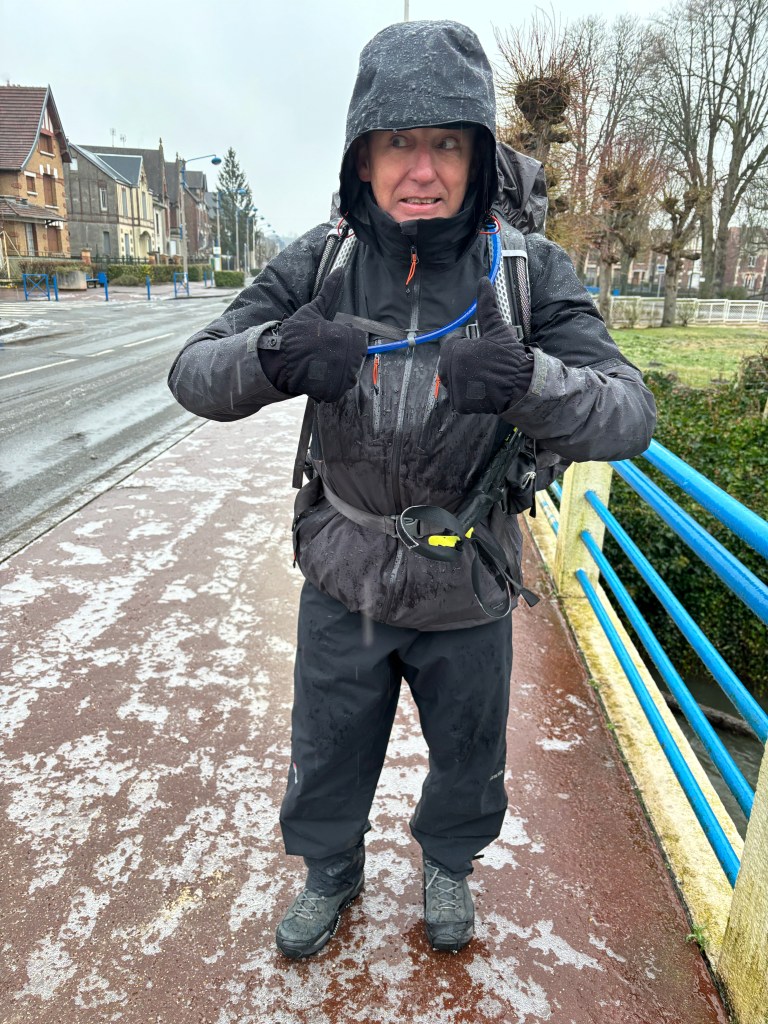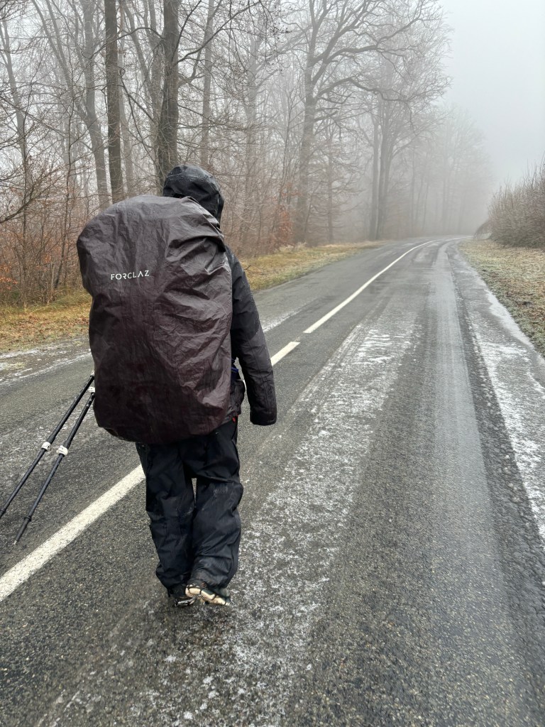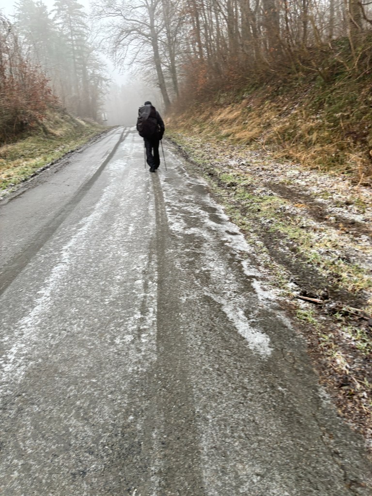 We waited hoping that the rain would melt the ice but alas it did not. 200 meters after leaving our accommodation I said I need my yaktrax on (ice/snowgrippers). Noël wasn’t convinced they would work but he humored me and we put them on. He was very pleased. He said they work in ice, snow and mud!! Unfortunately the metal coils can rip the rubber which is what happened with mine but they still worked.