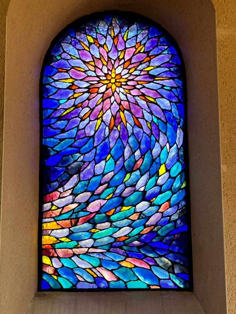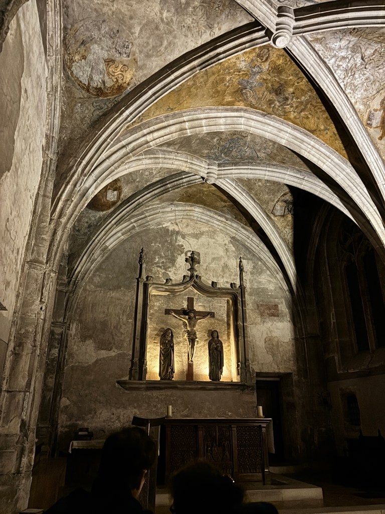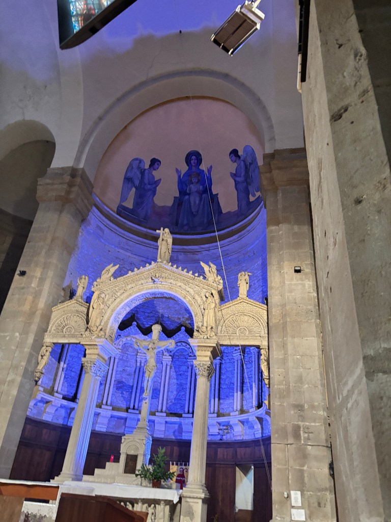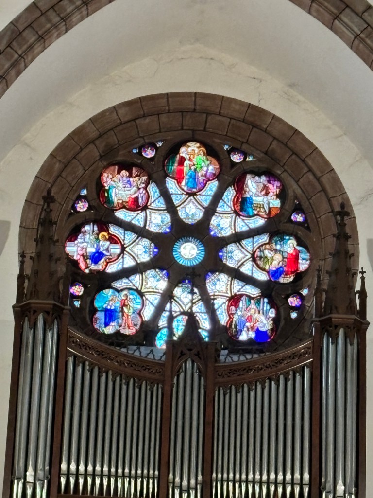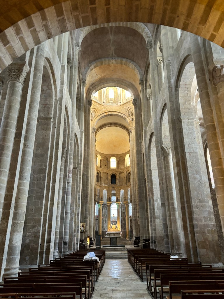 We also finally found an open gite. It’s 25 kms away, which could mean more. Our intention was to go to the pilgrim mass at 9 am but reflecting on it we decided that was too late to start with the distance and the climbs we have. So we headed back to the cathedral and went into the chapel of St Jacques and read the pilgrim blessing to each other and lit a few candles.