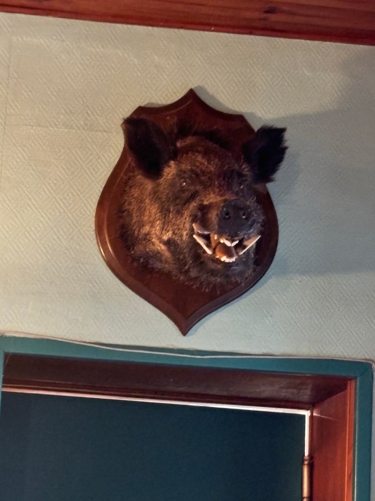 Then while sitting in a cafe I was looking around and saw a boar’s head over the door to the kitchen. I said, “Hey Noël, I have a surprise for you!! Look! It’s a boar up close!!” 😂