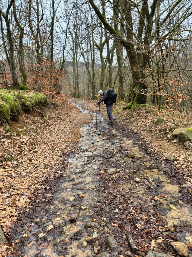 Until we were told to go straight into the forest and on the rocky terrain. The path started down and we were doing pretty well. Noël was flying. At one point the water was just pouring down the path. I yelled to Noël “keep going, I’ll be behind you. Only one of us needs to make it in time to the pharmacy!” He took off.