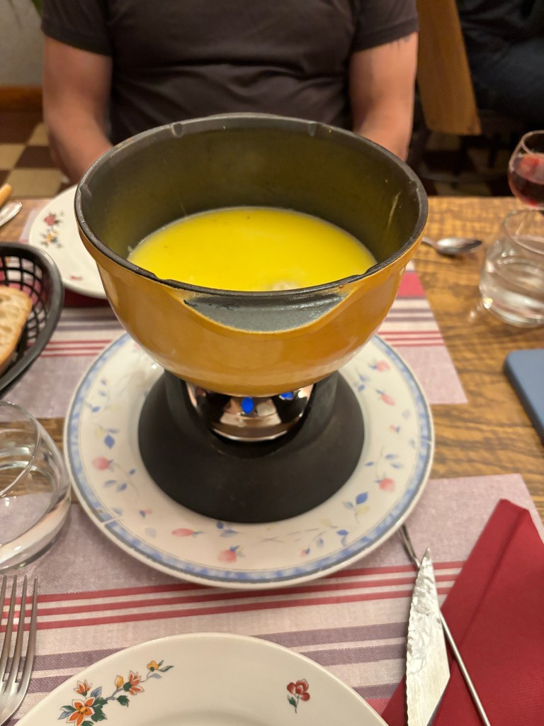 Today and tomorrow are rest days and our plateau. We are enjoying short walks to break in our shoes. They seem to be just right. Last night we ate dinner with a bunch of locals. And we both had cheese fondue for the first time.