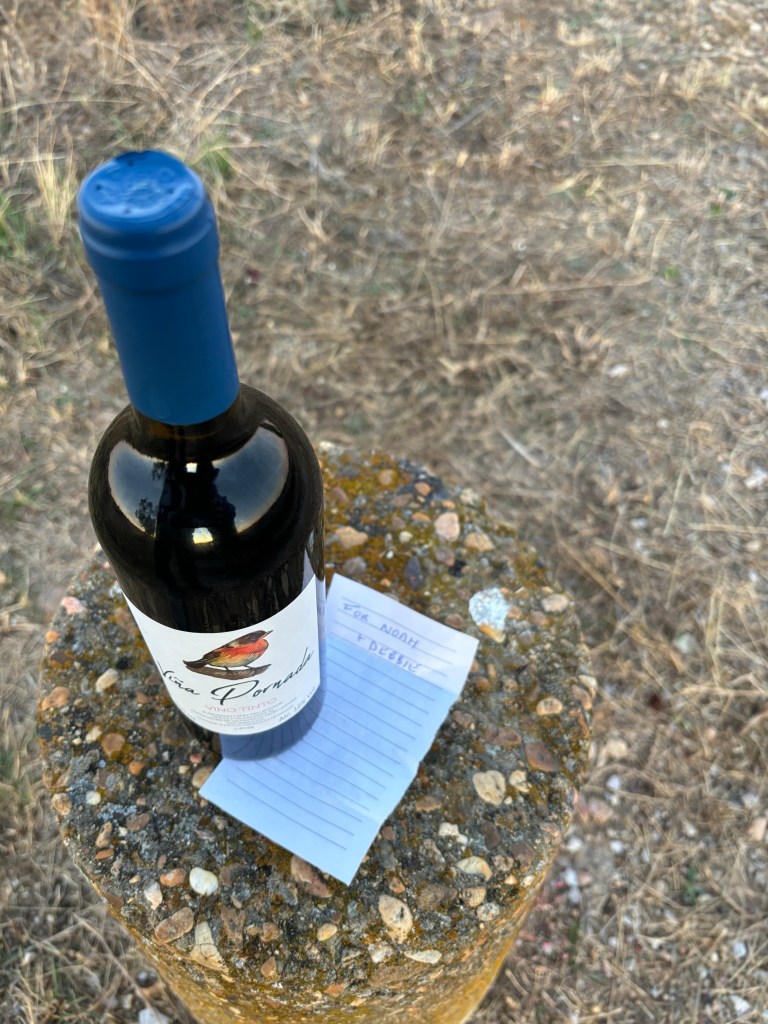 As we walked along the road in a nice path we saw ahead what looked like a bottle of beer on a camino marker. As we got closer we discovered it was a full bottle of wine with a note: for Noah and Debbie. We, of course, took it knowing Niel had left it for us. We found out that he had found the bottle along the trail. He carried it for a bit and decided since we had two bags we could carry it. 😂😂😂