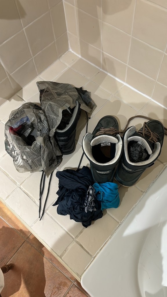 PS we were drying our shoes in the window sill and another rain storm hit so our boots are soaked again. Thank goodness for the lady at the grocery who gave us plenty of newspaper to dry them.