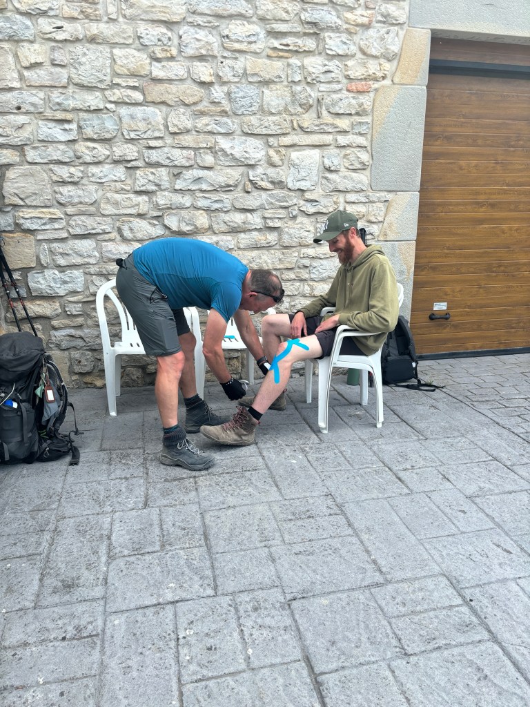 We met up again today and he asked about the sports tape he saw us wear on the first day. So Noël offered to tape his knee. We came to a village with only a vending machine and a few chairs and Noël got his knee taped. His plan once he reached Pamplona was to get another walking stick and some tape. As we walked along I offered him one of my sticks to see if it helped him. He was grateful for the help and advice and is planning to get another stick.