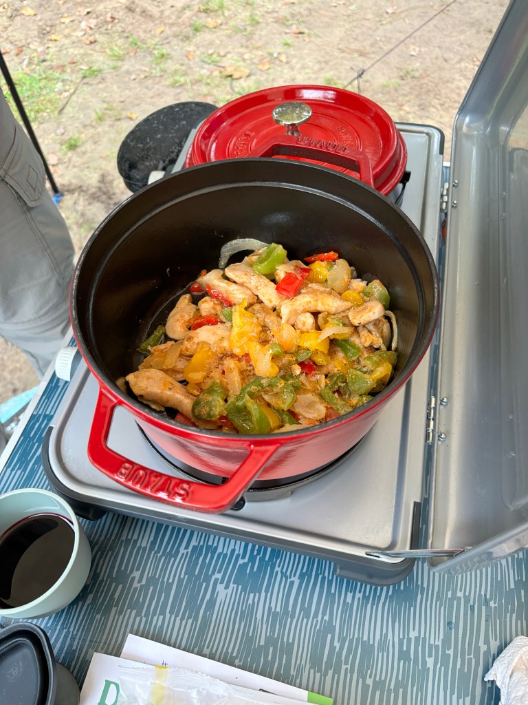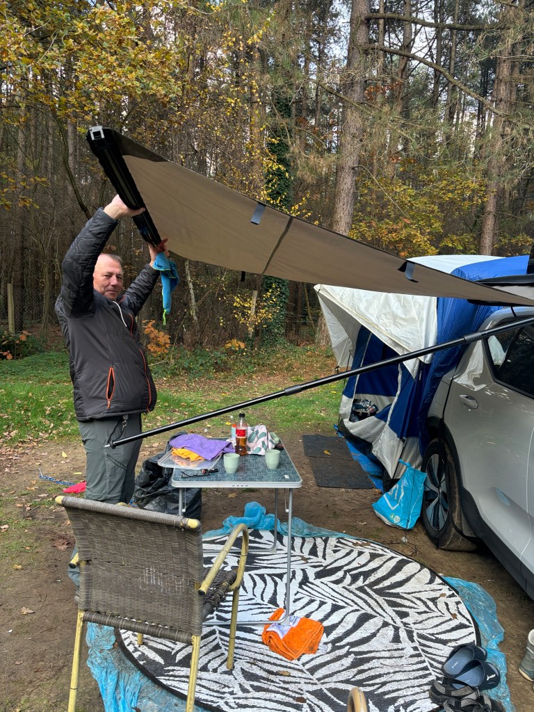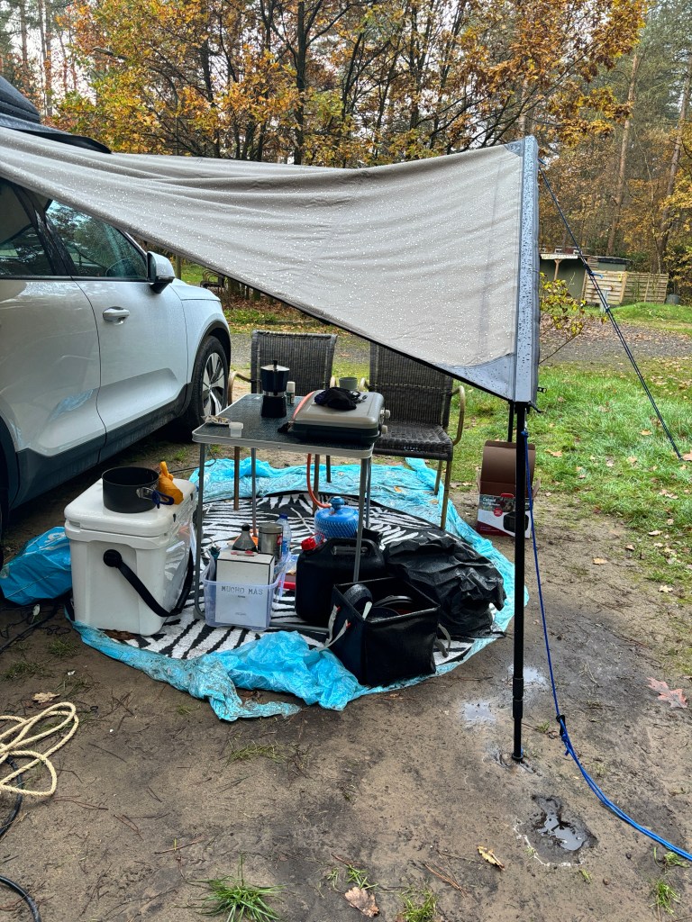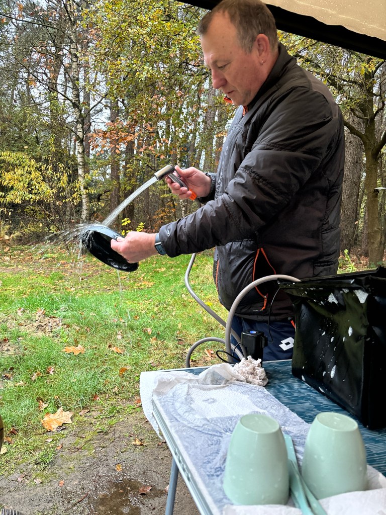 Our awning (luifel in Dutch) needs to be put away dry. So it was the first thing to get dried off and put away. The rug for under the awning needed to be rinsed off so we could put it away, it’s plastic. And then of course food, table, stove, yeti all needed to be inside.